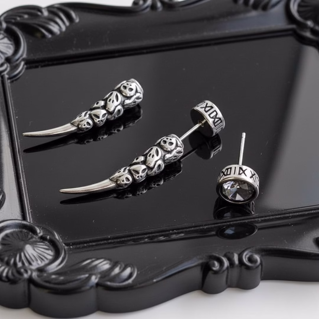 Inspirowane dawnymi wierzeniami i mrocznymi baśniami, te kolczyki przywodzą na myśl artefakty znalezione w zapomnianych kryptach. Każdy żłobienie na powierzchni kła opowiada historię o walce, mocy i nieuchronności czasu, symbolizowaną przez motyw czaszek. Ich forma nawiązuje do amuletów noszonych przez wojowników i mistyków, co czyni je doskonałym elementem do cosplayu fantasy czy stylizacji typu “vampire core”. Nosząc je, dodajesz swojej aparycji nutę tajemniczości, która intryguje i przyciąga spojrzenia niczym starożytne zaklęcie.