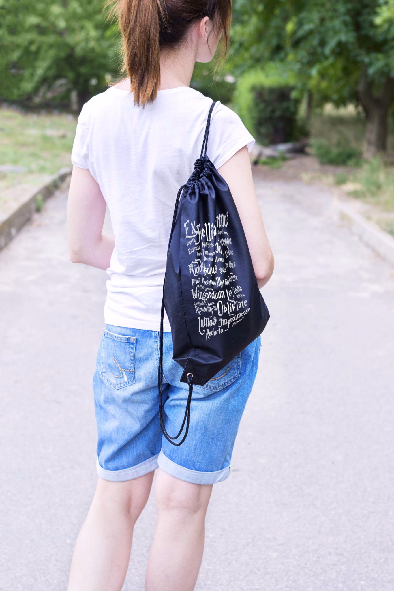 Worek plecak Zaklęcia Harry Potter z napisami, które pojawiły się we wszystkich częściach sagi o Harrym Potterze. Czarny worko-plecak miejski z nieprzemakalnej tkaniny z trwałym nadrukiem przedstawiającym magiczne zaklęcia.