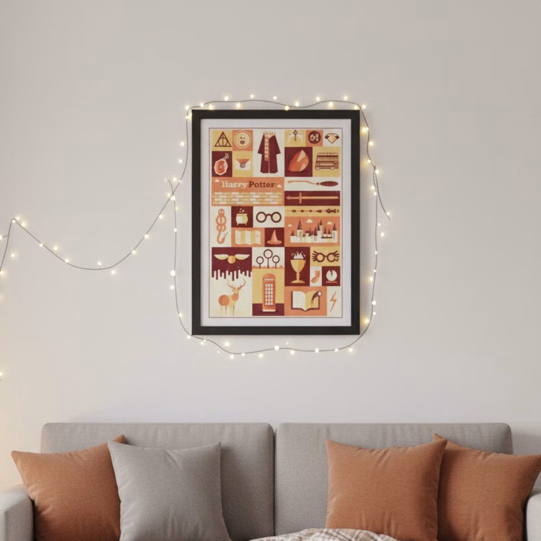 Plakat Harry Potter A3 w ciepłej, żywej kolorystyce, oprawiony w elegancką, czarną ramę, stanowi doskonałą dekorację pokoju dla miłośników sagi o Harrym Potterze. Skandynawska prostota ilustracji nadaje mu uniwersalny charakter, doskonale komponując się z nowoczesnym wystrojem pokoju młodzieżowego.
