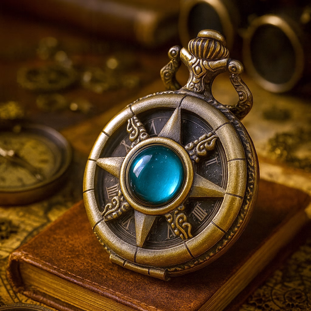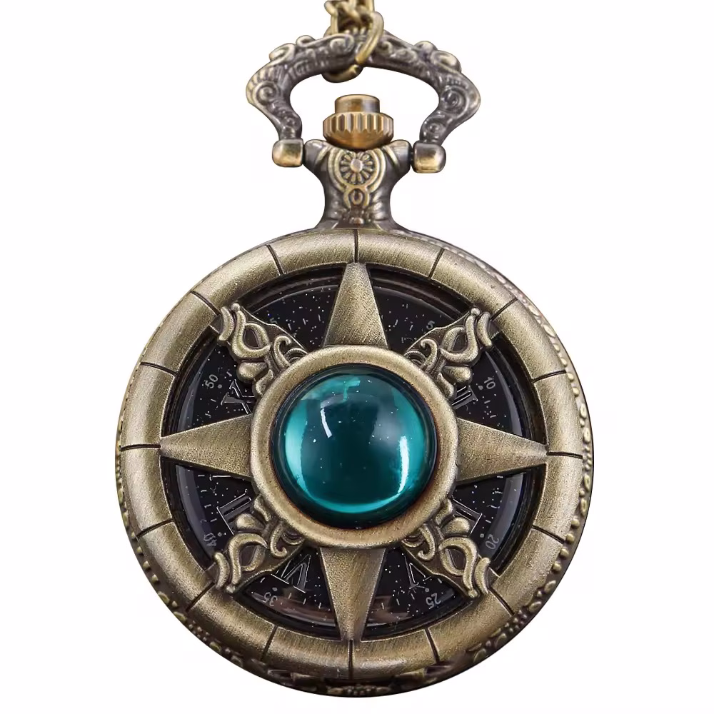 Stylizowany na antyczny zegarek kieszonkowy z motywem gwiazdy kompasu, ten wyjątkowy dodatek łączy w sobie estetykę retro, symbolikę podróży i magii fantasy. Na froncie uwagę przyciąga turkusowy kamień – niczym zaklęty punkt orientacyjny na mapie nieznanego świata. Z tyłu: misternie grawerowany, kwiatowy wzór, przypominający okładkę starej księgi lub magiczny herb rodu z sagi.
